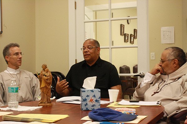 Project Joseph mentors Brother Chris Handal, left, a novice of Franciscans of Life, and Joseph King, center, speak about their work with Brother Jay Rivera.