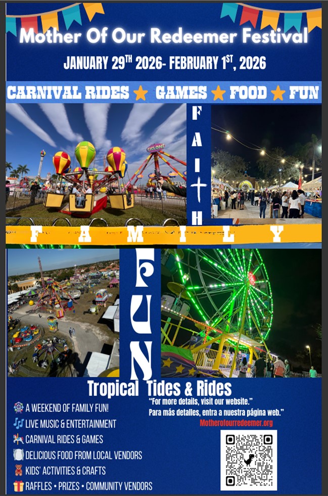 Visitenos para celebrar el festival anual de la Parroquia Católica Madre de Nuestro Redentor. 29, 30 y 31 de enero y 1 de febrero de 2026. Disfrute de comida multicultural, visite el pabellón de vendedores y diviértase en las atracciones mecánicas para niños y adultos. Descuentos disponibles por compra anticipada para los juegos mecanicos. Aproveche nuestras oportunidades de patrocinio, comerciantes y mas.