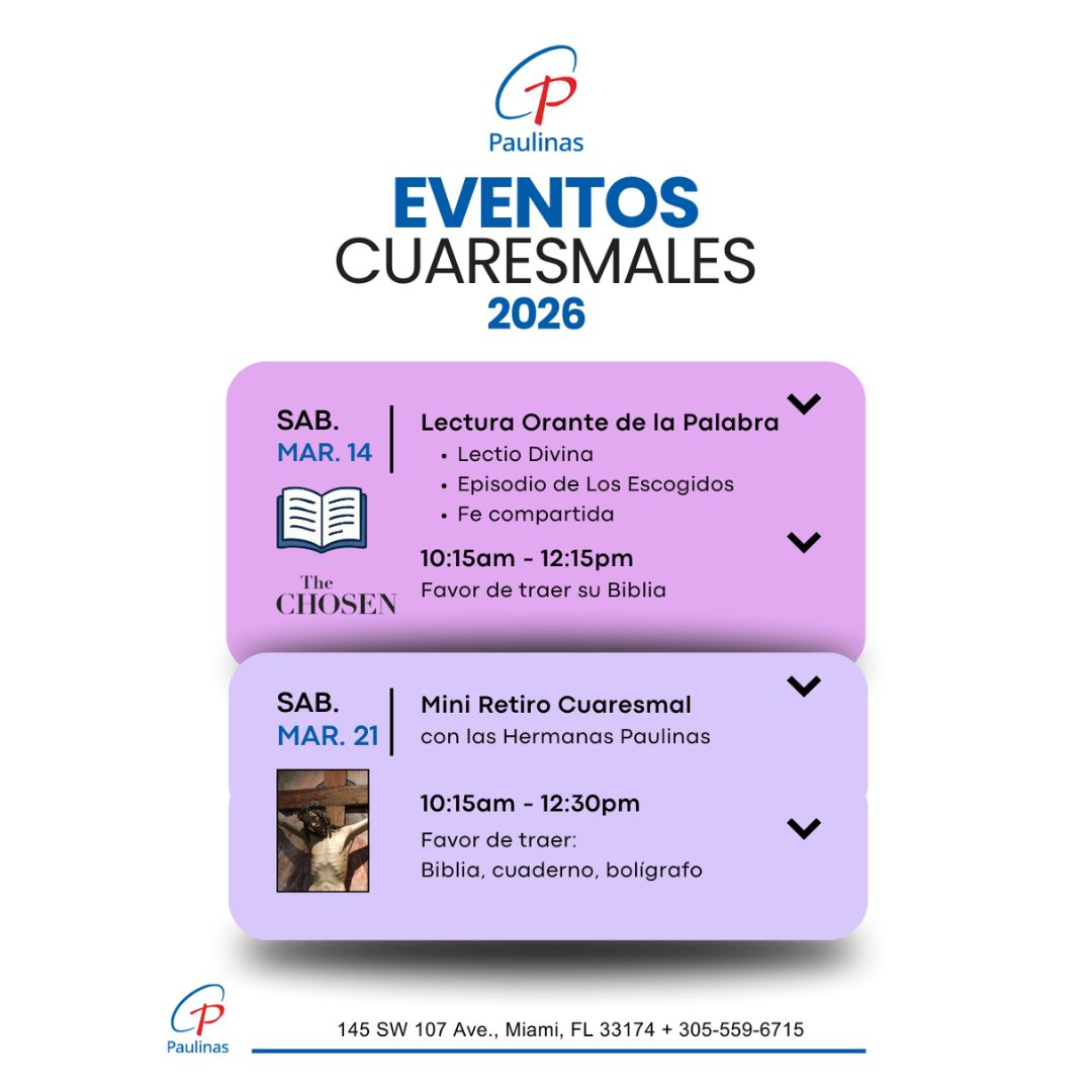 Prepárate para Pascua con una mañana de reflexión y oración con las Hermanas Paulinas. A través de Lectio Divina, profundización de la Palabra usando cine, y oración compartida, los participantes son invitados a reavivar su relación con Cristo. Este evento será en español.