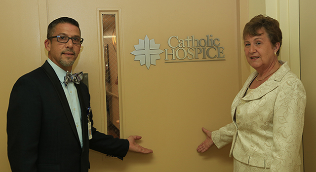 Ricardo Pol, director of Professional Services, and Bonnie Alkema, executive director of Catholic Hospice, stand at the entrance of the new Inpatient Unit at St. Anne's.