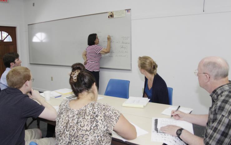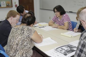 Lydia Hoyo, profesora del Programa realizado del 14 de junio al 2 de julio en el Instituto Pastoral del Sureste (SEPI), explica a sus alumnos la pronunciación de algunos términos eucarísticos.