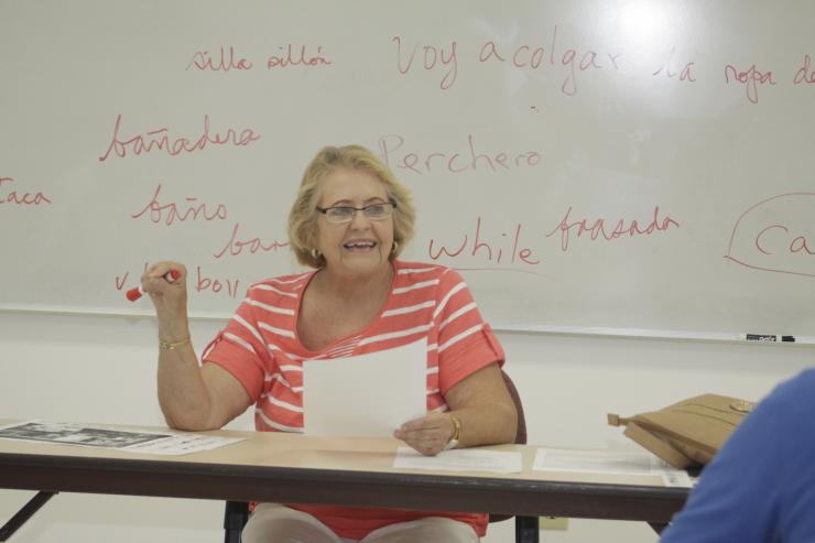 Margarita Voigt Poza, profesora voluntaria del programa de Inmersión en el Idioma Español y su Cultura del Instituto Pastoral del Sureste, SEPI, enseña a pronunciar correctamente en español algunos términos eucarísticos, durante una clase de lectura y pronunciación.