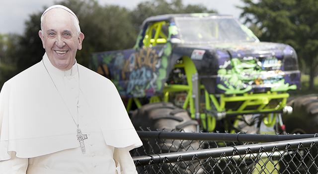 The Pope Francis cutout seems to be enjoying the Kid Monster Trucks behind him.