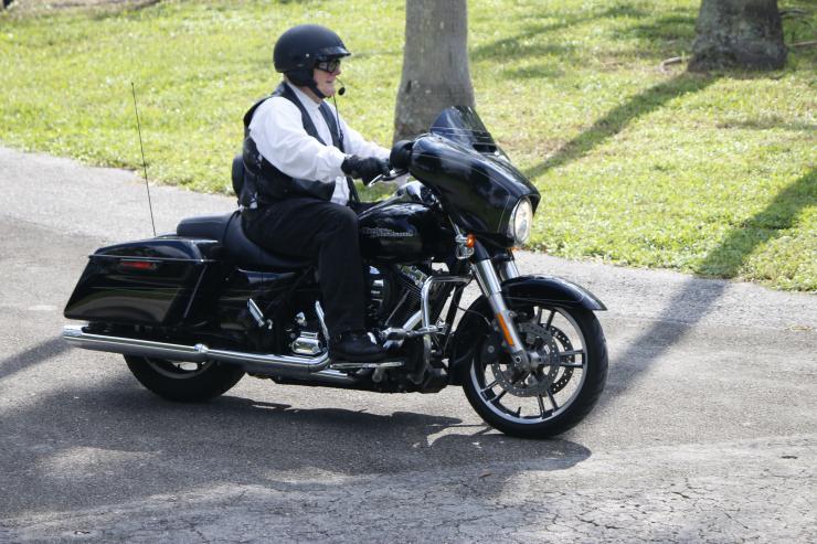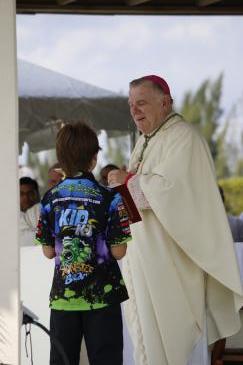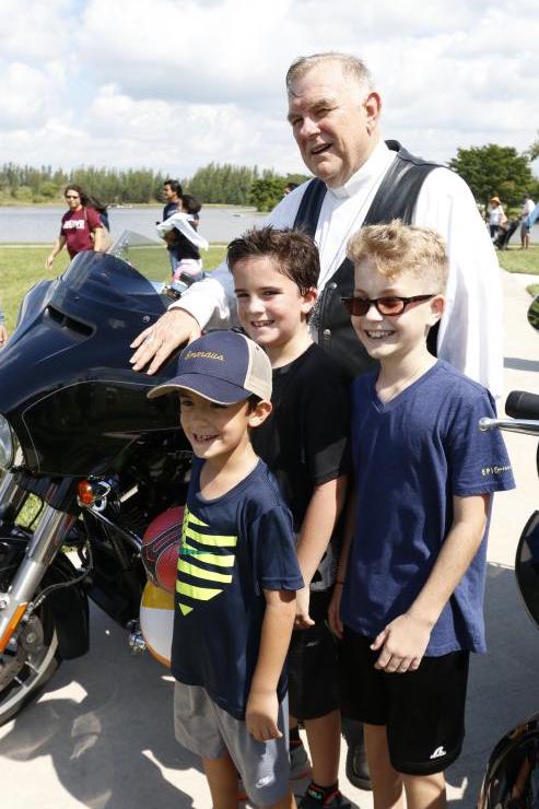 After Mass, Archbishop Thomas Wenski spent a long time posing for photographs, often with his Harley-Davidson. Here he takes a photo with Joey Pfeiffer, front, his brother Billy and their friend, Noah Rodriguez of St. Mark Parish in Southwest Ranches.