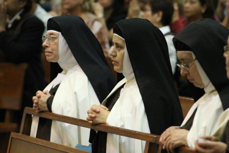 The Discalced Carmelites wait for the start of the Mass celebrating the 500th anniversary of the birth of St. Teresa of Avila. The nuns live in a temporary cloister in the former convent of the Sisters of Mercy on the grounds of Immaculate Conception Church in Hialeah.