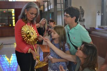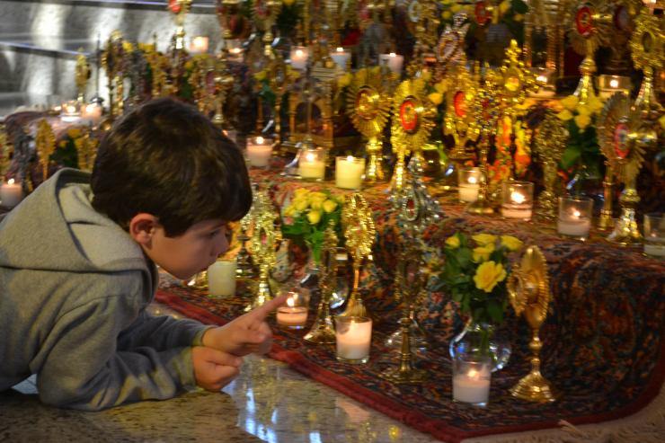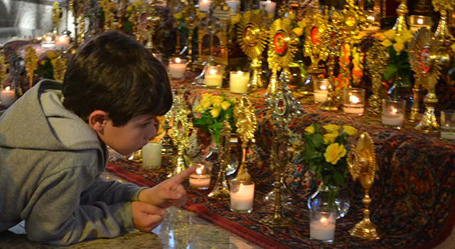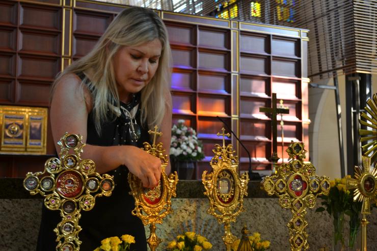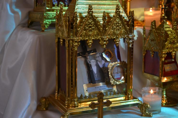 Some of the 300 relics, most from the private collection of Father Luis Largaespada, that went on display at Epiphany Parish on the weekend of All Saints and All Souls. Some of the 300 relics, most from the private collection of Father Luis Largaespada, that went on display at Epiphany Parish on the weekend of All Saints and All Souls. The large cross holder contains three pieces of the True Cross, a second degree relic. This holder contains relics of women who have founded religious communities. This holder contains the relics of Blessed Sister Maria Romero, a Salesian religious from Nicaragua who was a personal friend of the family of Muñeca Fuentes, one of the organizers of the display at Epiphany Parish. Some of the 300 relics, most from the private collection of Father Luis Largaespada, that went on display at Epiphany Parish on the weekend of All Saints and All Souls. Volunteer Pamela Ugarte touches a visitor's personal item to the relics on display at Epiphany Church Oct. 31-Nov. 2. Muñeca Fuentes, one of the organizers of the display at Epiphany Parish, holds up one of the relics for members of the Gabaldon family from Our Lady of Guadalupe Parish in Doral. From left: Maria Grazia Gabaldon, her dad, Gabriel Gabaldon, and mom, Andre Colonnello Gabaldon. Max Gabaldon of Our Lady of Guadalupe Parish in Doral gets an up close and personal look at the nearly 300 relics on display at Epiphany Parish on the weekend of All Saints and All Souls. Photography: MONICA LAUZURIQUE | FC