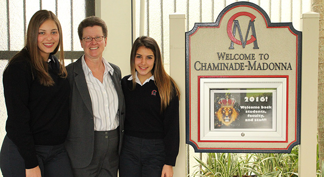 Bella's Kinship Group creators Isabella (left) and Gabriella (right) Glazer pose with Chaminade-Madonna College Preparatory President Judith Mucheck. Bella's Group was recognized by the Congressional Coalition on Adoption Institute as one of the 2015 Angels in Adoption. The non-profit serves as a support and social group for children being raised by their grandparents or other familial guardian.