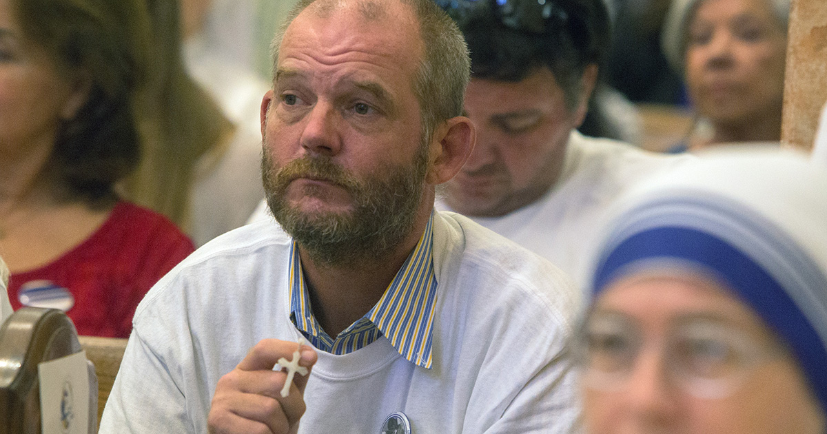 Un beneficiario del comedor de beneficencia de las Misioneras de la Caridad en Miami reza durante la Misa.
