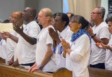 En Miami, las Misioneras de la Caridad se sentaron en los bancos delanteros de la Catedral St. Mary vistiendo sus conocidos saris blancos con rayas azules. Los voluntarios del refugio y los beneficiarios se sentaron al lado del pasillo, vistiendo camisetas blancas con la imagen de la Madre Teresa al frente y con sus palabras, "Cada niño es un regalo de Dios", en la espalda.