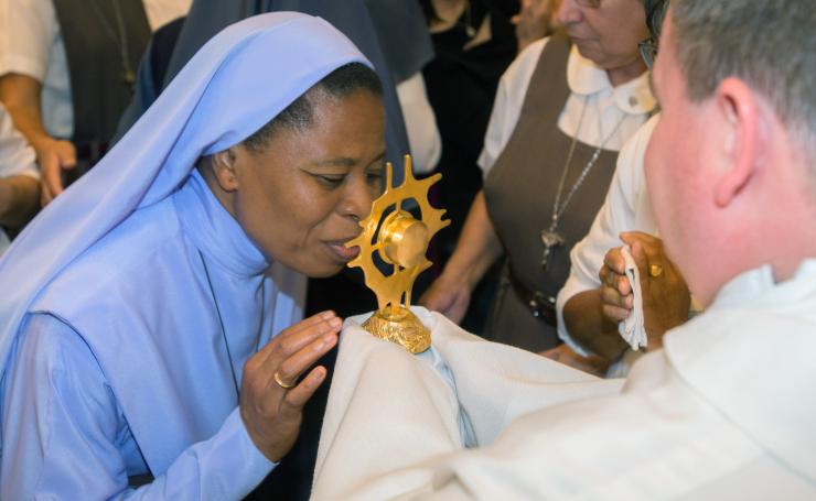 La Hna. María Philocordis, de la orden de Jesús el Salvador, besa la reliquia de la Madre Teresa después de la Misa.