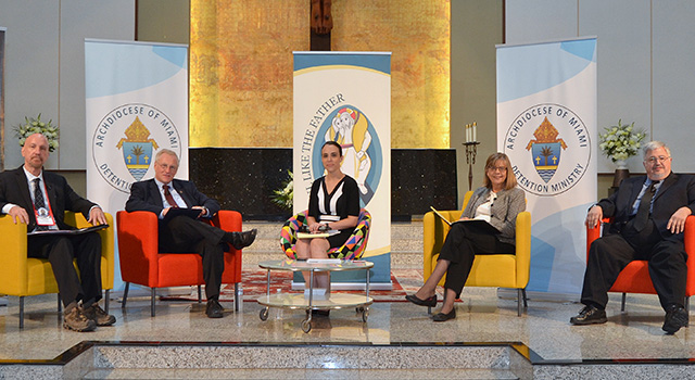 El panel de expertos que discuten la justicia de menores en la Conferencia De la Justicia a la Misericordia, en la iglesia Corpus Christi, en Miami. De izquierda a derecha son: Morris Copeland, director del Departamento de Servicios Juveniles de Miami-Dade; Elisa Quesada, profesora visitante de derecho de la Universidad Internacional de La Florida; Carlos J. Martínez, defensor público de la Corte del Circuito Judicial 11; el diácono Edgardo Farías, director del Ministerio de Detenciones de la Arquidiócesis; Ingrid M. Delgado, asesora adjunta de cuestiones sociales y respeto a la vida de la Florida; y Todd Bass, jefe de la división juvenil de la Oficina del Fiscal del Estado en Miami-Dade.
