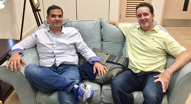 Dr. Shawn Fibkins, right, poses with his friend and life-saver, John Fernandez, after reflecting on the journey that brought them together at an Emmaus retreat at St. John Neumann Church in Miami. Fernandez is director of religious education at St. John Neumann. Fibkins is a radiologist now living in Parkland, where he is a member of Mary, Help of Christians parish.