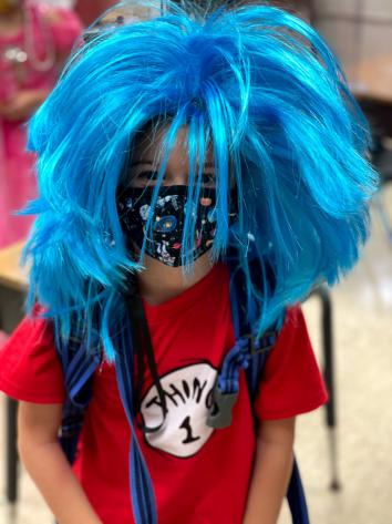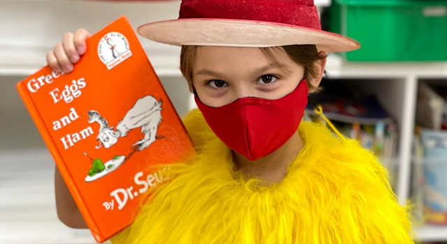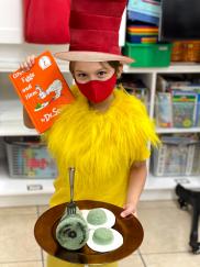 Costumed characters seen during the March 2, 2021 event included Zachary at the Zoo, Junie B. Jones, the Cat in the Hat's friends, Thing 1 and Thing 2, as well as Sam I Am serving up Green Eggs and Ham. Students also wore crazy hats and mismatched socks during the week.