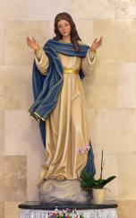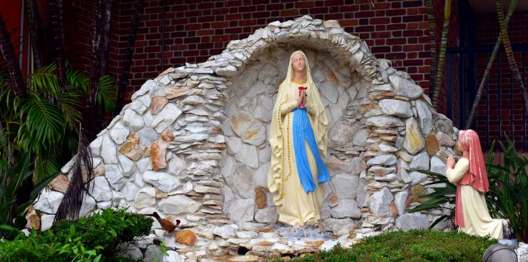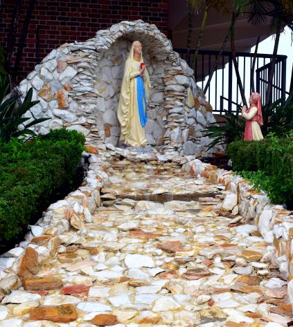 An outdoor shrine to Our Lady of Lourdes was added in 1992. Made of unfinished marble, the shrine includes a cascade of water flowing from the base of the Marian image.