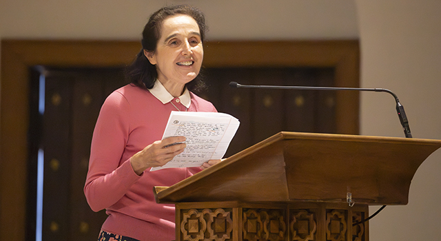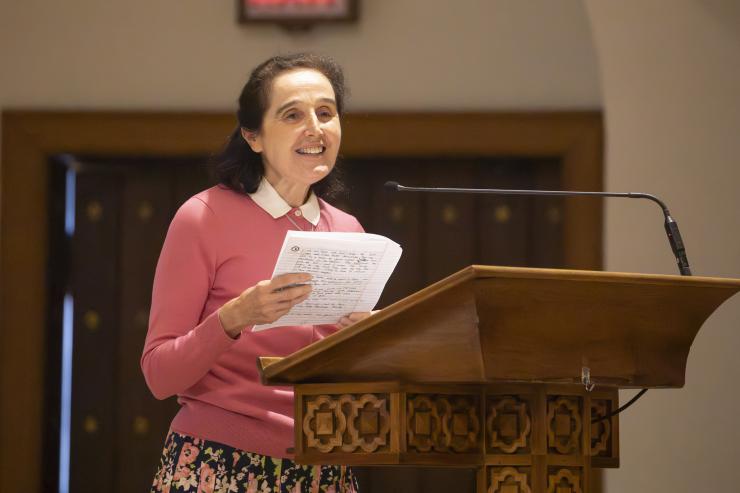 Gianna Emanuela, daughter of St. Gianna Beretta Molla and Pietro Molla, speaks to the faithful in attendance at the Mass launching the St. Gianna and Pietro Molla Miscarriage Ministry, Oct. 15, 2023.