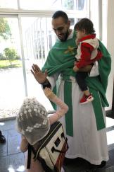 After a Mass celebrated at St. Rafael Chapel at St. John Vianney College Seminary in Miami for participants of the Bridging the Gap Conference on Sept. 26, 2025, Piarist Father Ricardo Rivera, principal of St. John the Apostle School in Hialeah, high-fives Galyana Cruz while carrying her brother, Giore'.