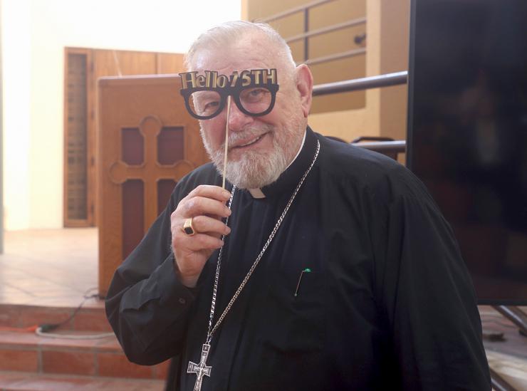 With masquerade glasses that read “Hello 75,” Archbishop Thomas Wenski gets ready to celebrate his birthday with Archdiocese of Miami Pastoral Center staff Oct. 20, 2025.