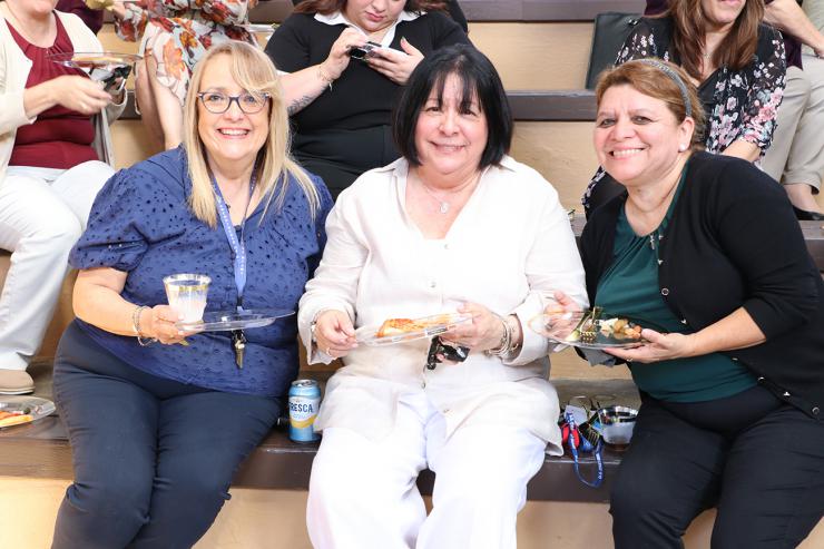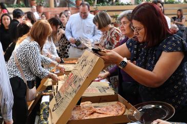 Pastoral Center staff and guests enjoy pizza during Archbishop Thomas Wenski’s 75th birthday party Oct. 20, 2025, at the Archdiocese of Miami Pastoral Center in Miami Shores.