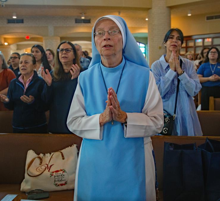 Sister Mary Rose, of the Daughters of Mary from New Hampshire, prays during a Mass at St. Mark the Evangelist Parish in Southwest Ranches celebrated as part of the Archdiocese of Miami Catechetical Conference on Oct. 24, 2025. After Mass, Sister Mary Rose led a breakout session for the conference held next door at Archbishop Edward McCarthy High School.