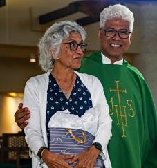 Dahlia Steele-Huie and Rosalinda Hally were honored at the Mass for their catechetical ministries. Steele-Huie of Our Lady of Mercy Parish in Deerfield Beach, has served as director of religious education (DRE) for 12 years. “Now more than ever, they need someone to look up to with all the distractions with what is going on in the world,” Steele-Huie said. “We need to be proud Catholics and profess our faith no matter where we are. When they go to college, they come back and they’ll call me.”