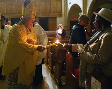 Archbishop Thomas Wenski shares the New Fire with Dubienna Maurice, a sacristan at St. Mary Cathedral, during Easter Vigil Mass at St. Mary Cathedral April 4, 2026.