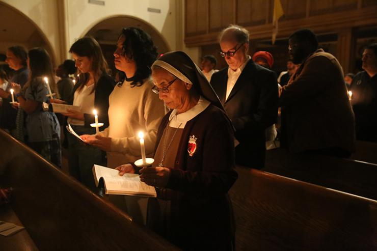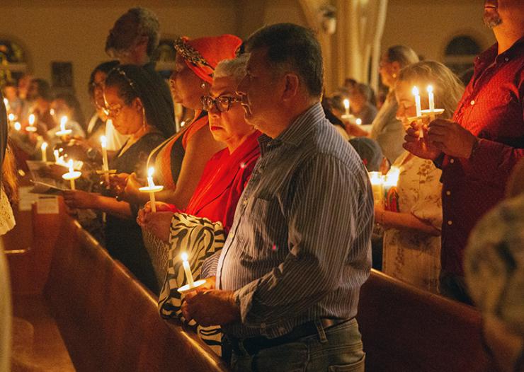 Congregants pray by candlelight during Easter Vigil Mass at St. Mary Cathedral, April 4, 2026.