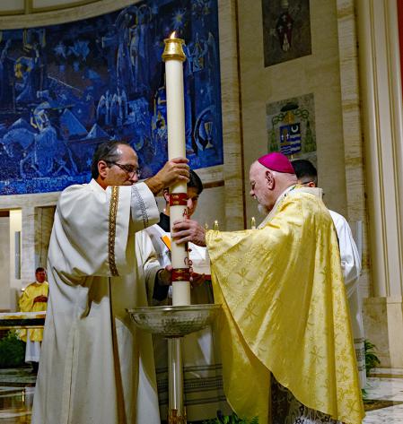 Deacon Sergio Sergio Rodicio holds the Paschal candle as Archbishop Wenski lights it during the Easter Vigil at St. Mary Cathedral, April 16, 2022.