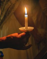 A parishioner holds a candle in the dark church during the Easter Vigil Mass April 19, 2025, at St. Mary Cathedral in Miami.