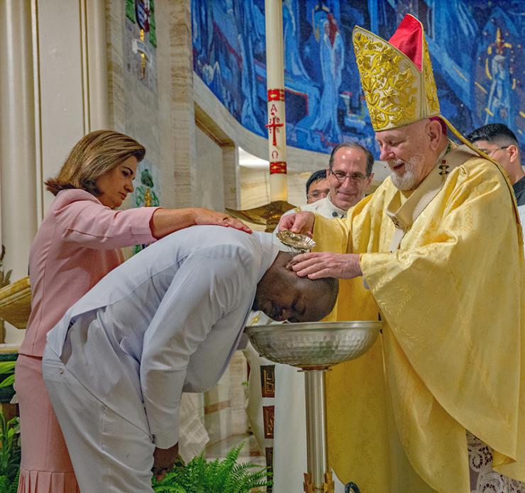 Archbishop Thomas Wenski baptizes catechumen Ricardo Ona at Easter Vigil Mass at St. Mary Cathedral, April 4, 2026.