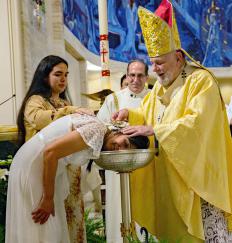 Archbishop Thomas Wenski baptizes catechumen Layania Martinez at Easter Vigil Mass at St. Mary Cathedral, April 4, 2026.