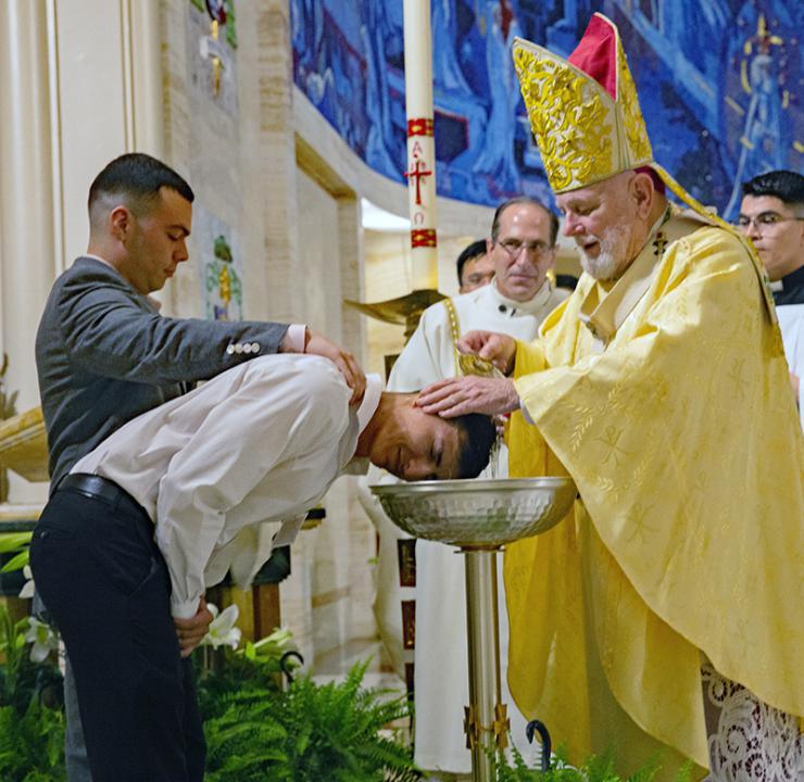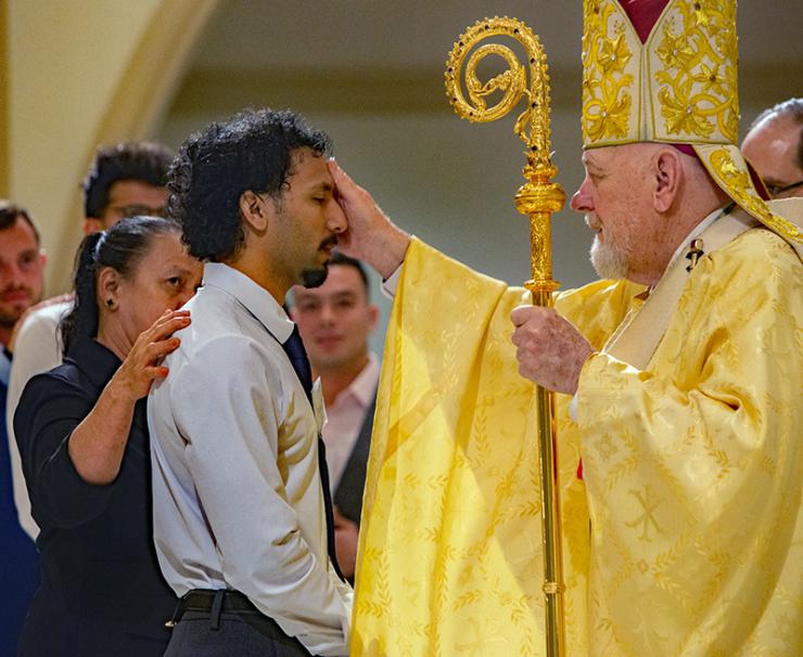Archbishop Thomas Wenski anoints Luis Lazaro during the celebration of the Easter Vigil at St. Mary Cathedral, April 4, 2026.