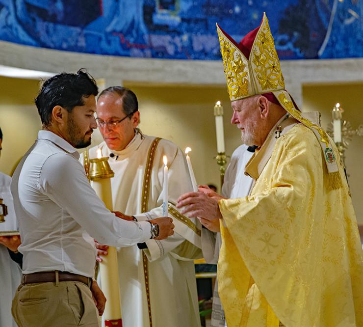 Archbishop Thomas Wenski gives a candle to newly baptized Juan David, during the celebration of the Easter Vigil at St. Mary Cathedral, April 4, 2026.