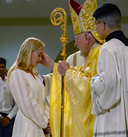 Archbishop Thomas Wenski anoints Brianna Moretz during the celebration of the Easter Vigil at St. Mary Cathedral, April 4, 2026.
