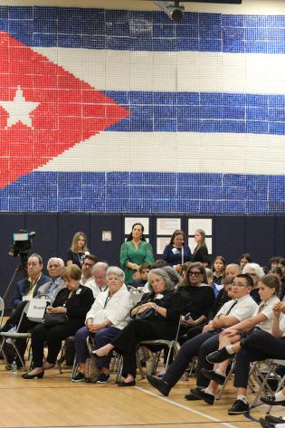 Students, teachers, and other guests at St. Louis Covenant School, Pinecrest, listen during the "Childhood in Exile: Operation Pedro Pan 2026" showcase, curated and hosted at St. Louis on March 16, 2026. In the background is a Cuban flag constructed from 14,000 “cafecito” cups representing the 14,000 unaccompanied minors that participated in Operation Pedro Pan.