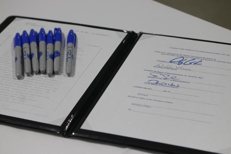 Gov. Rick Scott symbolically signs into law the ABLE Act (Achieving a Better Life Experience), which creates a trust fund to help disabled children and adults obtain services such as therapy and job training. Looking on are state Rep. Ray Rodrigues, left, of Fort Myers, state Sen. Eleanor Sobel of Miami-Dade and Broward counties, center, and Barbara Palmer, far right, director of the state Agency for Persons with Disabilities.