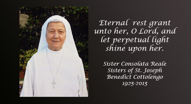 Sister Consolata Reale, Sisters of St. Joseph Benedict Cottolengo: Born 1925, entered religious life 1948, died 2015.