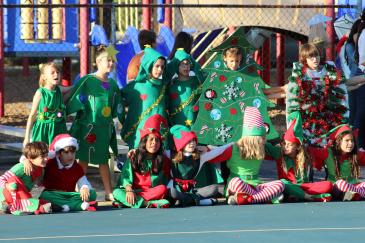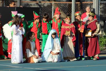 A Christmas Nativity scene, with some of Santa's elves in the background, is a must during the Christmas play performed by third graders from Sts. Peter and Paul School during their Christmas around the world-themed STREAMS Day.