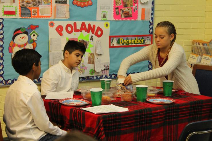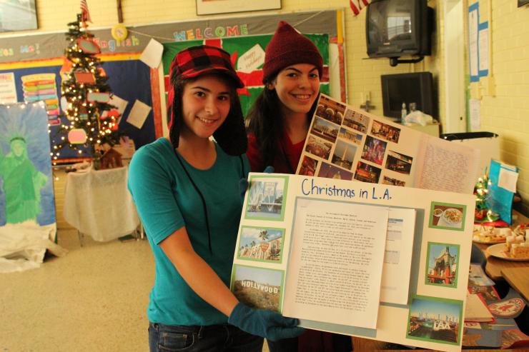 Meanwhile, west of Israel across the Atlantic, in the tropical climate of Cuba, Noche Buena (Spanish for Christmas Eve) was underway with middle school teacher Vicki Alvarez and some of her students. A student-made salsa dancing music video introduced visiting students to the customs, sights and sounds of the island-nation during the holidays. To add to the celebration, maracas and conga drums were handed out. Students shimmied to the music of Celia Cruz as they lined up for a photo booth inspired by Noche Buena.