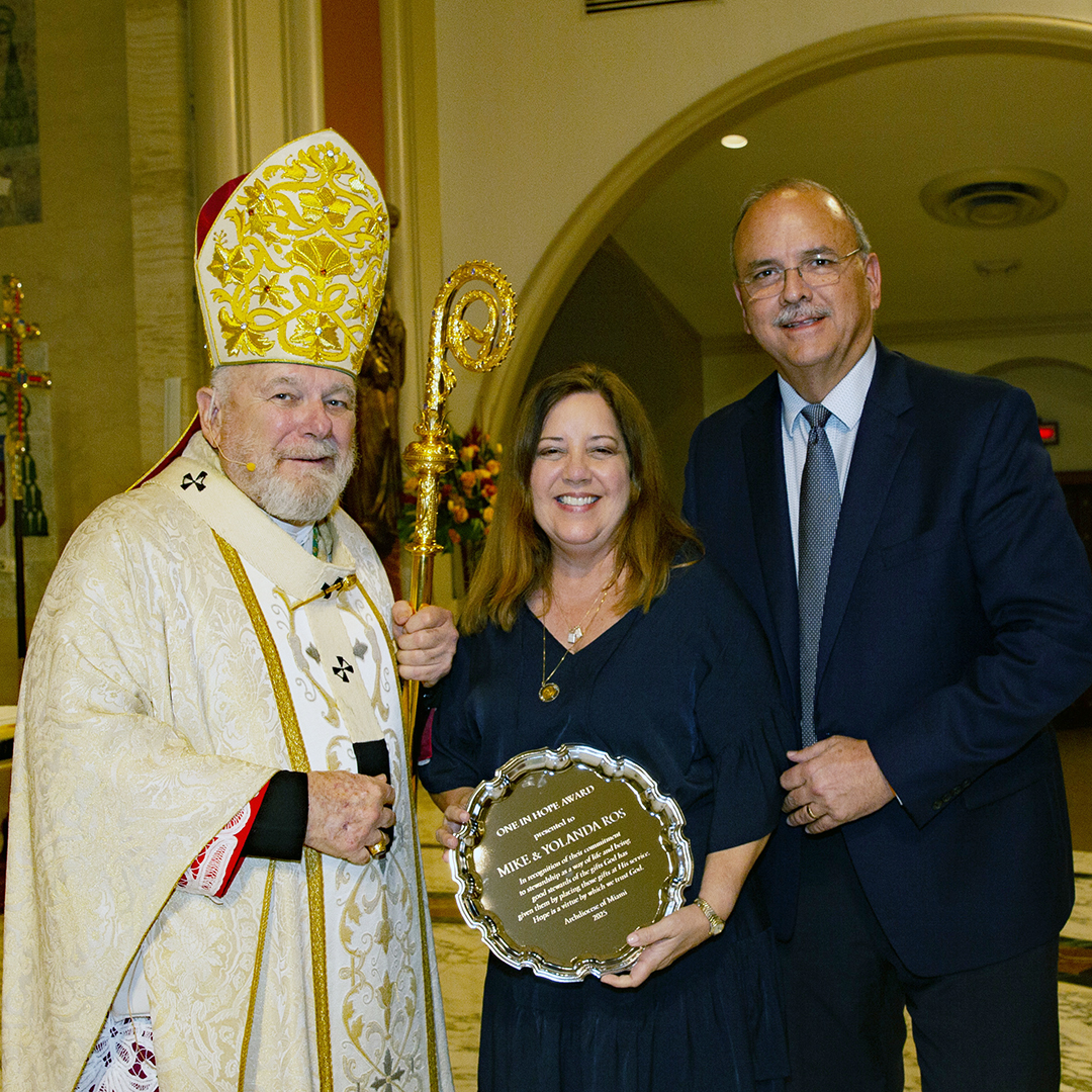 The Roses were honored with a One in Hope Award at the annual Thanks-for-Giving Mass organized by the archdiocesan Development Office Nov. 22, 2025, at St. Mary Cathedral in Miami. The award honors those who bring hope by modeling stewardship of their time, talent and treasure, sharing their gifts sacrificially, justly and abundantly.