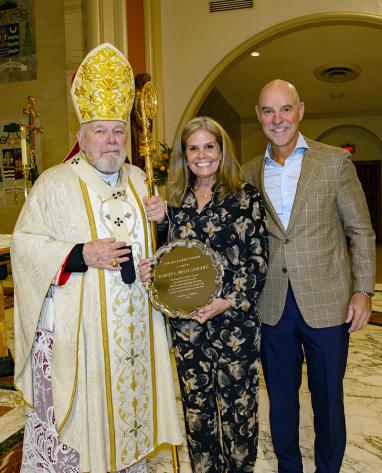 Archbishop Thomas Wenski presents Mike and Yolanda Ros, of St. Mark Parish in Southwest Ranches, with the 2025 One in Hope award during the annual Thanks-for-Giving Mass hosted by the archdiocesan Office of Development to honor those who contribute faithfully to the ABCD. The Mass was celebrated Nov. 22, 2025 at St. Mary Cathedral in Miami.