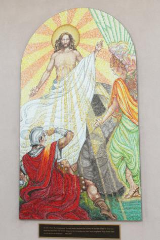 On the outer buildings of the Resurrection Complex are four Italian-produced mosaics of the resurrected Christ commissioned by Conrad Pickel Studios in Vero Beach, Florida. Standing at 10.5 feet tall, the northern buildings’ mosaics depict scenes of Christ’s resurrection, and the three Marys meeting the angel at Christ’s empty tomb. The southern part of the complex contains the mosaics of Christ ascending into heaven, and Christ the King.