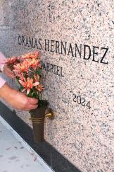 Marta Garcia places flowers at the tomb of her uncle, Gabriel Oramas Hernandez, who is buried in the Resurrection Mausoleum Complex at Our Lady of Mercy Catholic Cemetery in Doral. Archbishop Thomas Wenski blessed the complex Nov. 14, 2025.