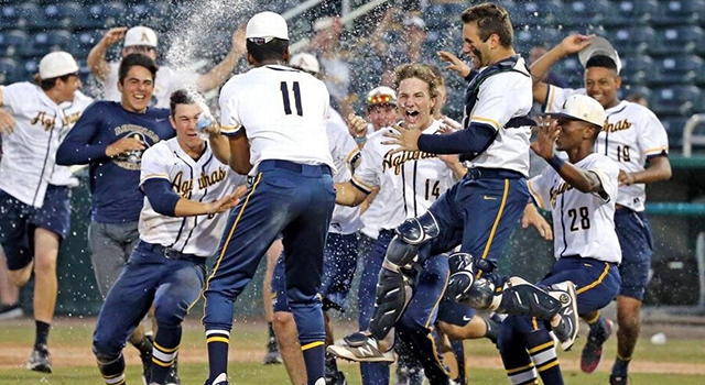 St. Thomas Aquinas High School's baseball players celebrate their 8-4 victory over Sarasota to claim their first state championship since 2003. The team ended the season with a 27-3 record.