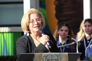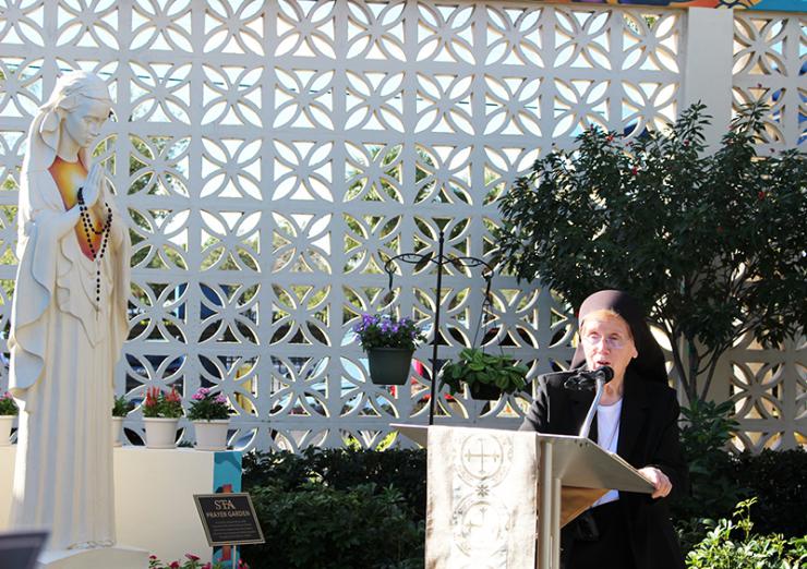 Sister Elizabeth Worley, chancellor for administration and chief operating officer of the Archdiocese of Miami, speaks at the St. Thomas Aquinas High School Prayer Garden dedication Oct. 23, 2025. The Fort Lauderdale high school's Prayer Garden recognizes Sister Worley and the archdiocese's women religious whose prayers and service have strengthened Catholic education in the Archdiocese of Miami.