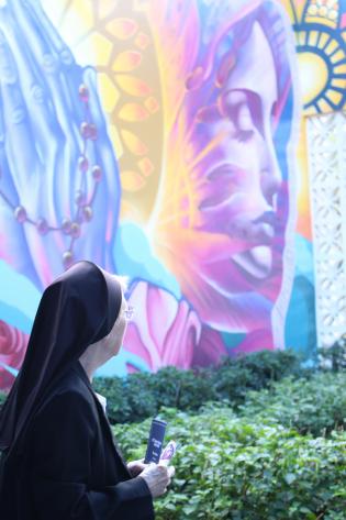 The walls surrounding the garden courtyard, painted in dynamic sunrise colors by artist Cavan Koebel of Raw Sol Art, include Our Lady’s face in profile, the Holy Spirit’s wings blooming into flower petals, and more. The iconic statue is surrounded by greenery and flowers in purple, pink and white shades, matching the mural.