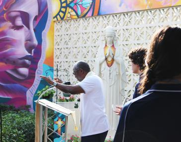 Father Celsus Auguiste, theology teacher and spiritual director at St. Thomas Aquinas High, sprinkled holy water on the garden. In his speech, he said to Sister Worley, “The garden epitomizes all the work you have done” in its blossoming.