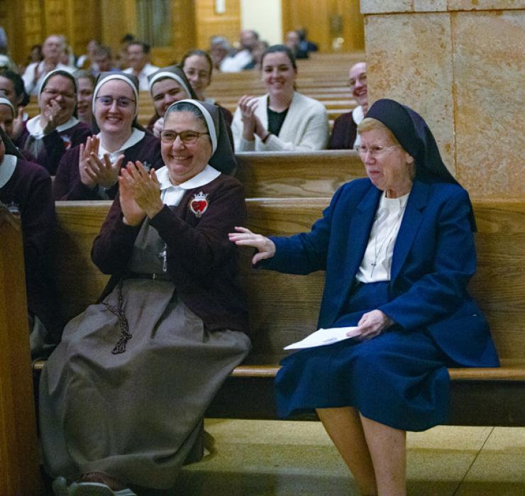 Sister Elizabeth Anne Worley, right, reacts as Archbishop Thomas Wenski recognizes her 60th anniversary in religious life during the Feb. 4, 2023 celebration of the World Day for Consecrated Life. At left is Sister Ana Margarita Lanzas of the Servants of the Pierced Hearts of Jesus and Mary, who serves as directress of the Office for Religious in the Archdiocese of Miami.