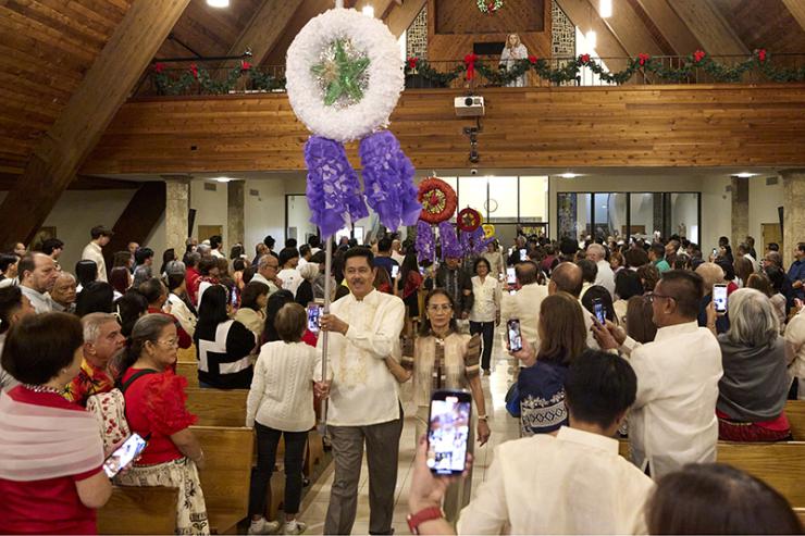 Rey and Belle Cabal, members of the Filipino Apostolate process into St. David Church in Davie, carrying traditional parols on the ninth night of the Simbang Gabi novena, Dec. 23, 2025.
