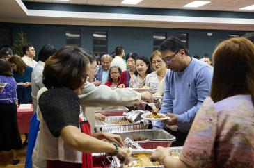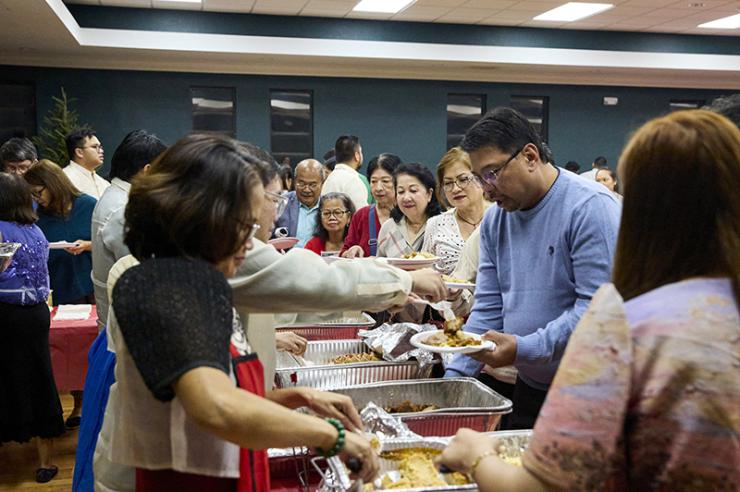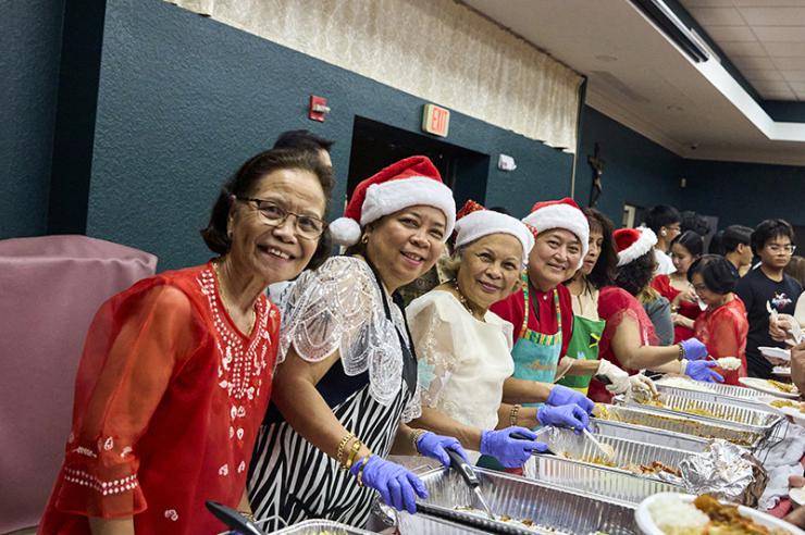 Volunteers of the Filipino Apostolate of the Archdiocese of Miami serve traditional Filipino food after Mass celebrating the ninth night of the Simbang Gabi novena at St. David Parish in Davie Dec. 23, 2025. From left are Jun Sadusta, Aida Silos, Marcie Bacomo and Nena Nitullano.