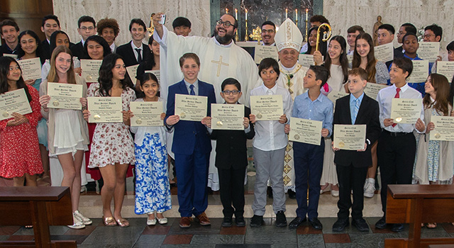 Father Matthew Gomez, archdiocesan vocations director, jokingly takes a selfie as altar servers pose for a group photo with their awards at the conclusion of the annual Mass and Altar Server Awards ceremony sponsored by the Miami Serra Club. It took place April 30, 2023, at St. Raphael Chapel on the campus of St. John Vianney College Seminary in Miami, with Auxiliary Bishop Enrique Delgado presiding.